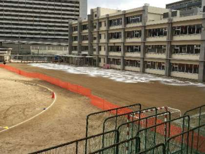 工事エリア内の運動場整備が朝から進められていましたが、最終段階に入ったようです。にがり(白く見えるもの)をまいています。