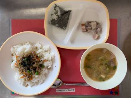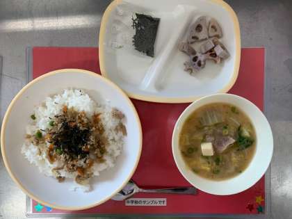 今日の給食は、小学校と中学校共に「鶏ごぼうご飯、みそ汁、焼きれんこん、牛乳」です。