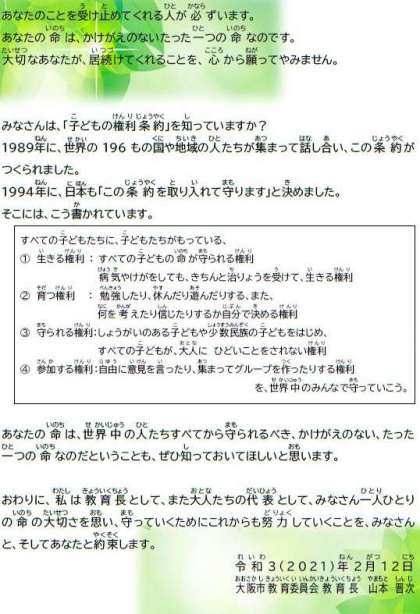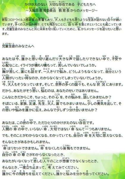 これらのことから別添のとおり、本市の子どもたちに向けて「教育長メッセージ」を