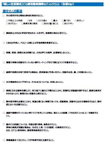 イエローステージでの部活動が再開され最初の休日となりますので、改めてチェックリストを掲載いたします。ご家庭においてもご協力をお願いいたします。