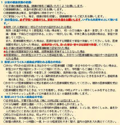 保護者のみなさまには、これまでも、新型コロナウイルス感染症に対して、お子様の日常の健康状態の把握や感染症予防をお願いしているところですが、政府による大阪府への「まん延防止等重点措置」の実施を受けたことから、感染拡大防止の趣旨を踏まえ、次のとおりお子様の健康状態の把握ならびに感染症予防の指導について、引き続きよろしくご理解ご協力をお願い申しあげます。