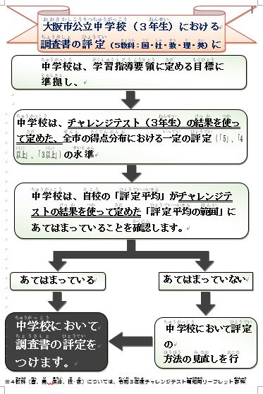 令和(れいわ)4年度(ねんど)大阪府公立高等学校入学者(にゅうがくしゃ)選抜(せんばつ)における調査書(ちょうさしょ)に記載(きさい)する評定(ひょうてい)等(とう)に関(かん)する中学生チャレンジテストの活用(かつよう)についてご確認ください。