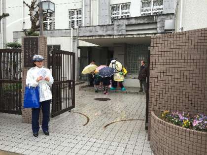 学校の周りには見守り隊など大勢の方々が登校の安全確保の支援してくださいました。西成のキャラクターも来てくれました。(写真中)