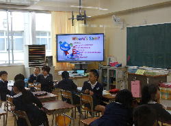いまみや小中一貫校では、朝、英語のフォニックスの学習をしています。大型液晶画面を使った音と映像でこどもたちに英語の発音と文字になじんでもらっています。