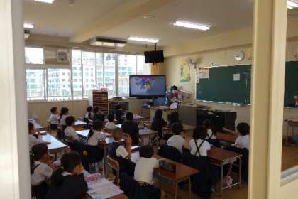 大きな液晶モニターは3年生以上が標準なのですが、3小学校から持ってきた電子黒板を配置しているので、1年生、2年生の教室にも電子黒板があります。これを使って、週に3回、朝の英語学習に取り組んでいます。