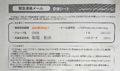 さて、先日小中含めて全員にお名前入りの写真のようなプリントを配布しています。できれば保護者の皆さんにぜひともご登録いただきたいと思います。全市募集になったことも含めまして、遠足その他の行事の実施、中止、延期などについての連絡はこれまででしたら学校や近くの連絡掲示板などを活用しておりましたが、それでは十分にお知らせできないし、もとより出かけなくてはなりません。学校に電話を掛ける手もありますが、電話代がかかるし、在校生の人数が増えた分、こういった急ぎの電話もつながりにくくなります。