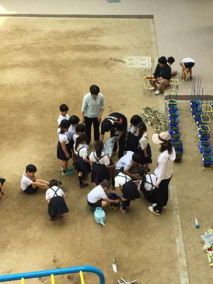 午後からサブグラウンドで2年生がミニトマトの苗を植えました。