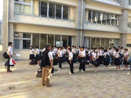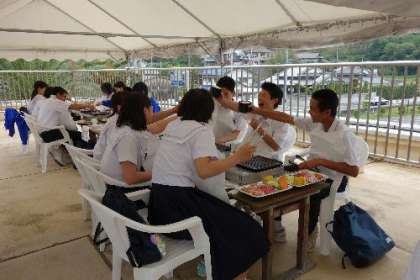 バスで学校を出発。まずは、「しまなみ海道」に向けて。お天気は問題ないはずなのに、西に進むにつれて、前方の雲行きが怪しくなってきて、しまなみ海道にやってきたときには小雨がぱらついていました。サイクリングは無理なのかと心配になりました。