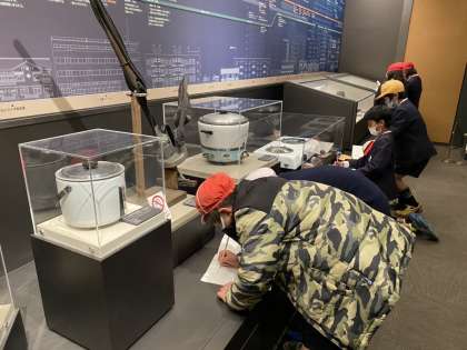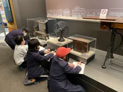 くらしの今昔館では、昔の道具や街並みについて、実物や模型を見ながら、真剣に学んでいます。