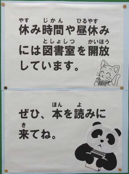 通常の休み時間や昼休みなども開館していることや課題図書のお知らせなどがありました。これは普通の学校ではなかなかないですよ。