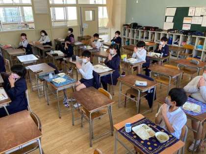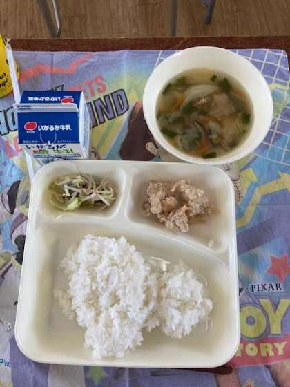 今日の献立は、ごはん・牛乳・鶏肉のから揚げ・中華スープ・チンゲン菜ともやしのあまずあえです。