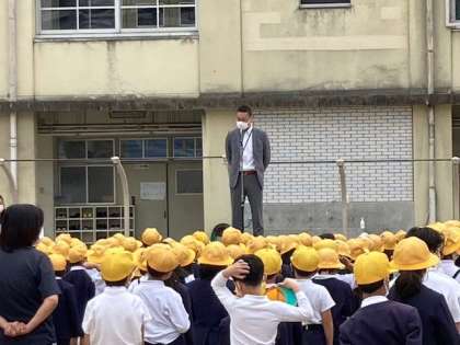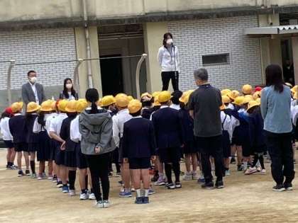 5月9日朝、小学校全校朝会がグランドで行われました。