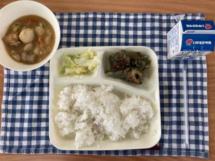 今日の献立は、ごはん、牛乳、ちくわのいそべあげ、あつあげとさといものみそ煮、あっさりキャベツです。