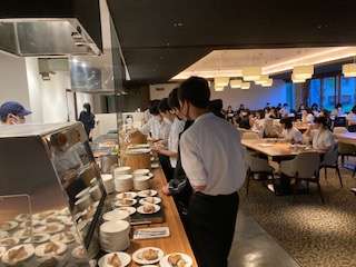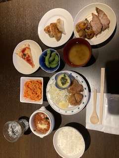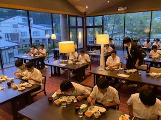 夕食はバイキング形式です。料理もですが、アルプスの天然水のお水がとても美味しいです。