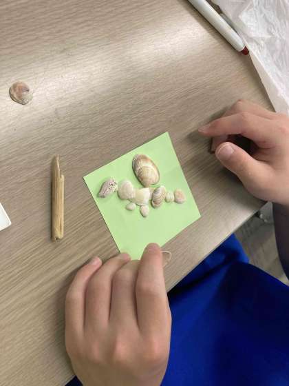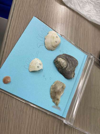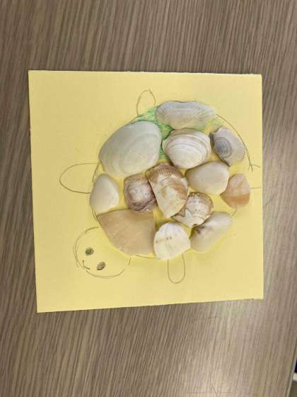 2日目最初の活動はシェルメモリーです。10?四方のケースに昨日に砂浜で集めた貝殻をボンドで貼っていきます。