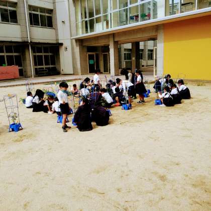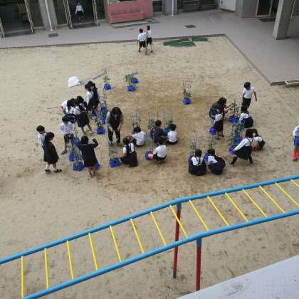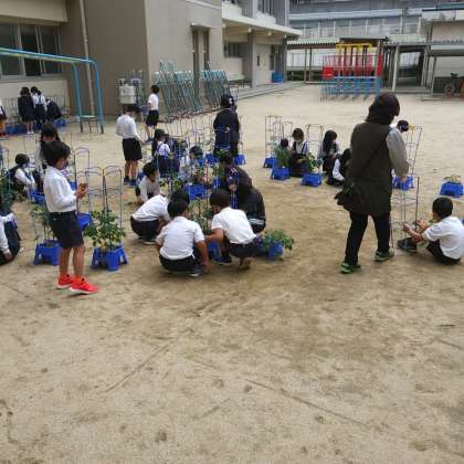 5月16日(月)1時間目、中庭にて、2年生がミニトマトを栽培する学習に取り組んでいました。先生の話をよく聞きながら、自分達で、脇芽を取り、支柱を立てる作業をしました。児童みんなが協力して活動していました。