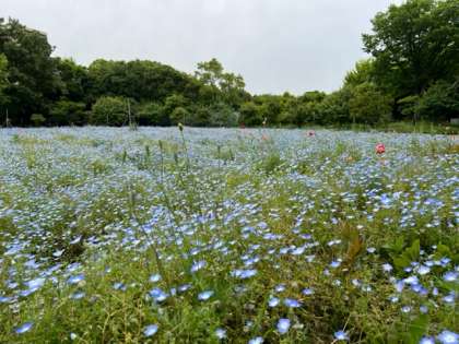 ネモフィラのお花畑のそばで、楽しみにしていたお弁当を食べています。
