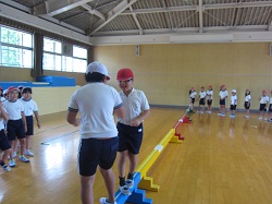これは4年生の体育の学習の様子です。本校では、運動場、体育館、格技室の3つの場所で体育の学習を行うことができます。今日は運動場が雨のため使えなかったので、格技室を使って体幹やバランスを鍛える学習をしました。子どもたちは「勝った!!」「負けた!!」と言いながら、楽しく体を動かしていました。