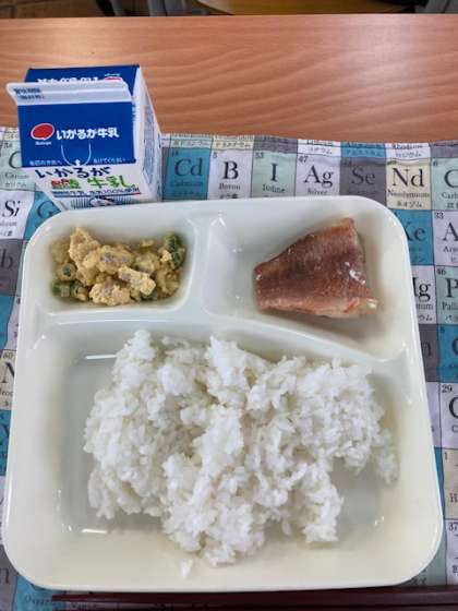 今日の献立はごはん、あかうおのしょうゆだれかけ、みそ汁、えんどうの卵とじ、牛乳です。