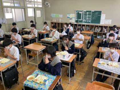 えんどうは、グリンピースとも呼ばれています。日本全国で栽培され、ハウス栽培などで一年中出回っていますが、旬は春から初夏にかけてです。給食では、普段冷凍のグリンピースを使っていますが、今日は給食室でさやから豆を取り出して調理しています。
