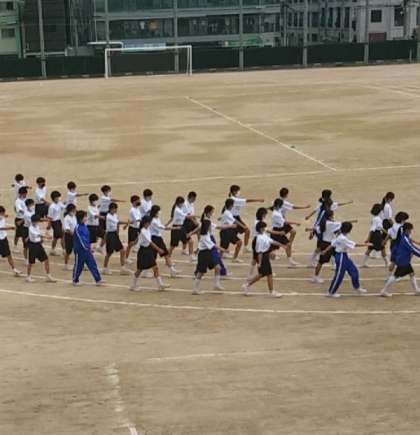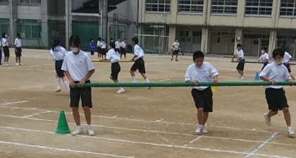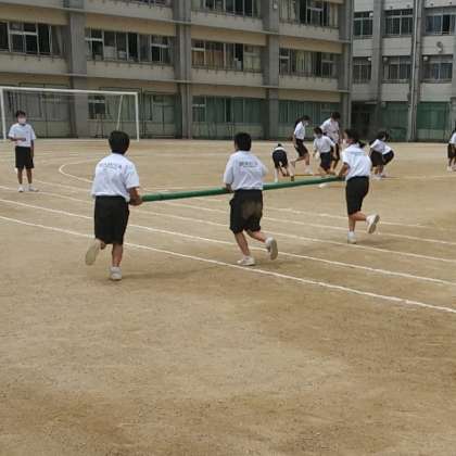5月30日(月)、いまスポの学年競技の「台風の目」の練習が始まりました。3人で長い棒をもって、勢いよく走り、台風の目のようにコーンを回って、バトンの長い棒を飛び越える競技です。各チームの協力が成果に繋がります。頑張りましょう。