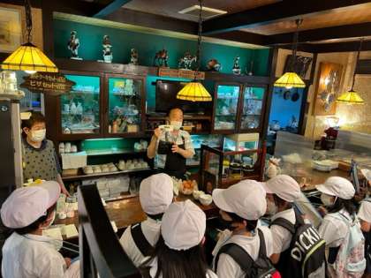 ひとつのグループは、喫茶店『白木屋』さんを訪問し、コーヒーを挽く様子を見せていただきました。質問コーナーでは、人気メニューや何時から何時までお店が開いてるのかなど教えていただきました。