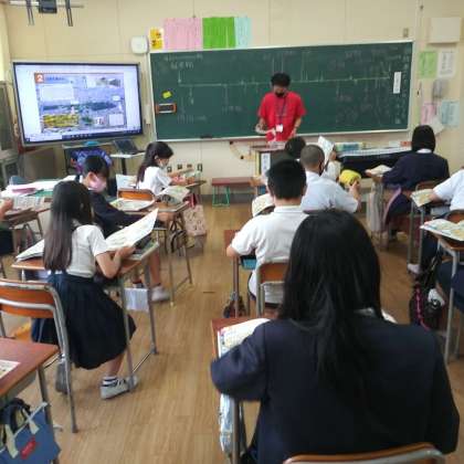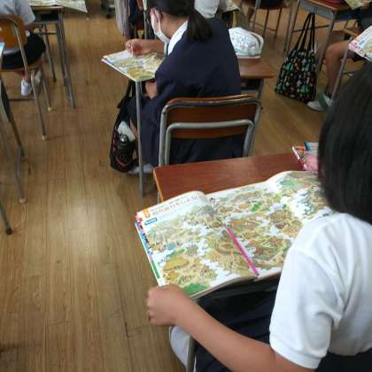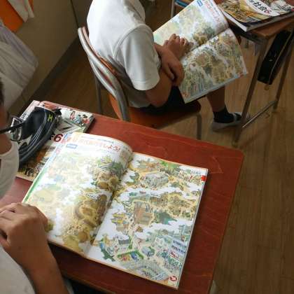 デジタル教科書を見て地球の歴史を学んでいました。時代を旅行しようという学習を資料集の迷路のような地図を使って学習していました。