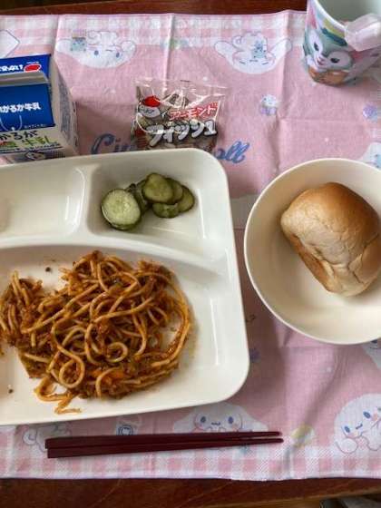 今日の献立は、黒糖パン、牛乳、スパゲッティミートソース、きゅうりのピクルス、アーモンドフィッシュ、発酵乳です。