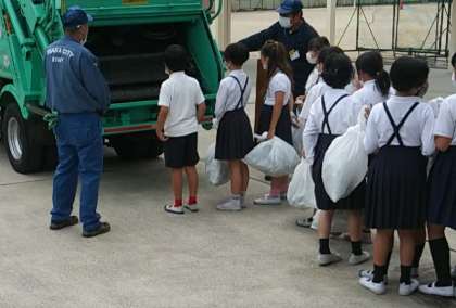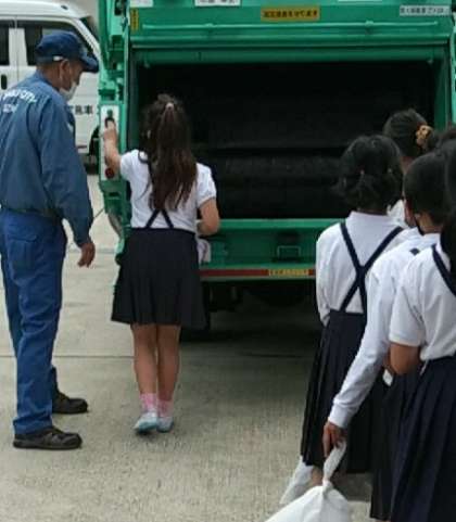 6月7日(火)、4年生の出前授業で、大阪市環境局の方とパッカー車に来てもらいました。ごみ収集車では、4種類の音楽が流されています。その時々によって、回収するごみが異なります。