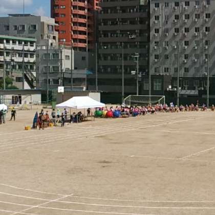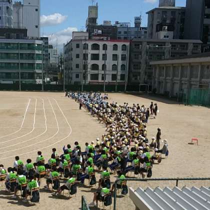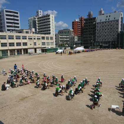 運動場に、各自の椅子を持ち出し、4色のゼッケンを身に付けて座席に着き、整列しています。