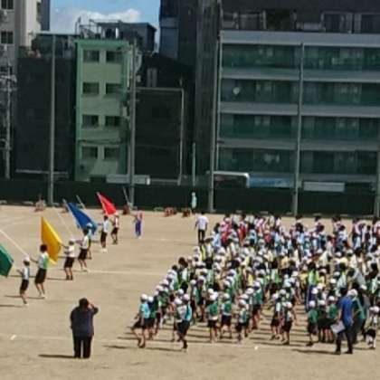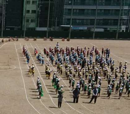 行進曲に合わせてグランド中央に整列し、その後、プログラムにしたがって進んでいきました。応援合戦は、4グループごとに行われています。