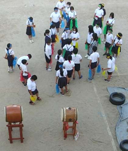 6月9日(木)放課後、応援団の練習が行われていました。太鼓を叩く音に合わせて動きの確認をし、その後、先生を囲んで、16時半過ぎまで手足の動きの確認をしました。