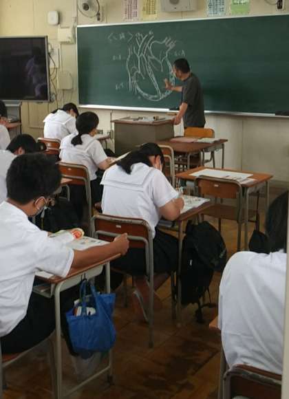 6月10日(金)、心臓の働きについて学習をしていました。黒板に大きく書かれた心臓の図を見て、心臓の役割や働きを学んでいました。