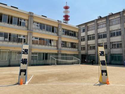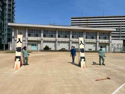 5・6年生と中学生による準備に先立って、管理作業員さんと先生方で入退場門を設置していただきました。