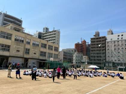 児童・生徒が集合し、前日準備の説明が始まりました。実行委員長の先生から「今日の準備が、当日のスムーズな運営につながる」とお話がありました。