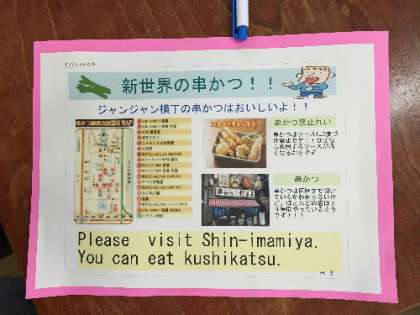 これまで大阪紹介の観光マップを作り、それを今日の授業でインタビューの仕方を学び、次には新今宮に出て外国人とコミュニケーションするという流れ。