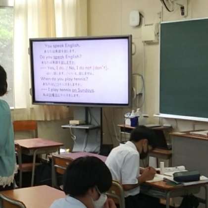 7年生の英語の授業です。期末テストに向けて、電子黒板を活用して学習していました。