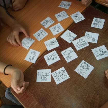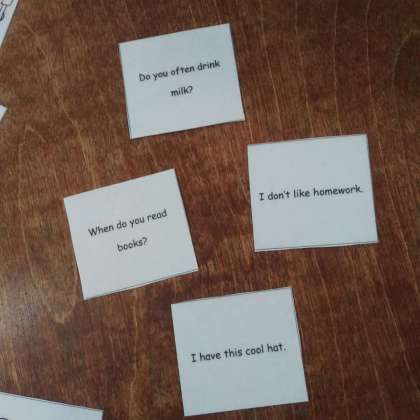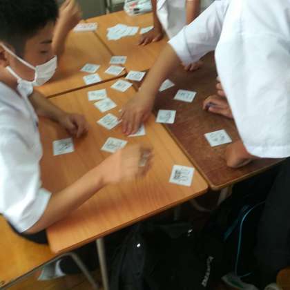 6月16日(木)、カードの表裏に英文と絵が書かれているものを見て、英文からカードを取り合う授業をしていました。