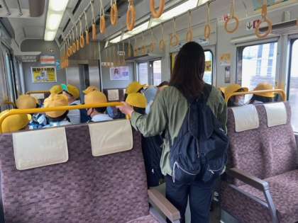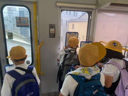 ハルカスを後にして、環状線に乗って移動します。移動中も何が見えるか窓の外を見ながら、みんなしっかり勉強しています。そして、次はみんながお待ちかねの、アレです!