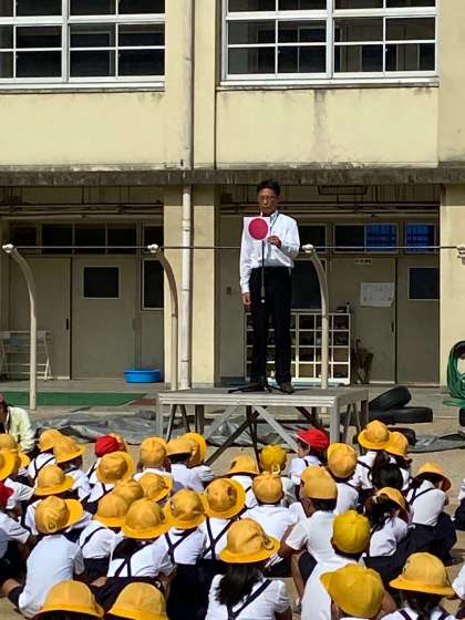 風があるとはいえ、真夏を思わせる日差しが降り注ぐ6月27日の朝、小学校全校朝会が行われました。