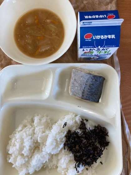 今日の献立は、ごはん、さごしの塩焼き、みそ汁、牛ひじきそぼろ、牛乳です。