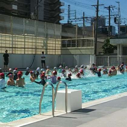 6月29日、1時間目にプールの授業が行われました。体育館前でラジオ体操をし、プールサイドで水浴びし入水、プール内では、まず、顔を水に浸ける練習から水中ジャンケンなどをしていました。