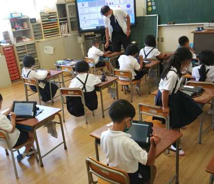 6月29日5時間目、学活に変わって振替授業が行われていました。1・2・3年生は、タブレットを使っての学習をしていました。5年生は、グループ活動でタブレットを操作していました。