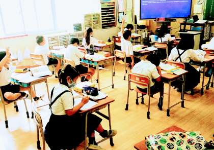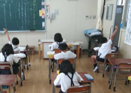 7月5日(火)、3年生の授業です。慣用句について、教科書、プリントの絵を見ながら国語事典で調べて、発言していました。