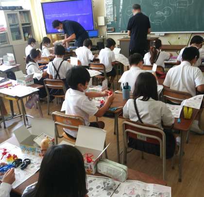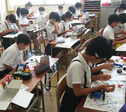 7月6日(水)、4年生の理科の授業で、各自でプラモデルを作成し、電池を使って直列と並列の学習をしていました。