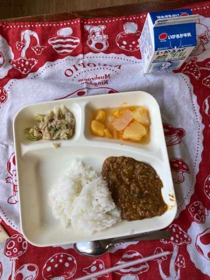 今日の献立は、夏野菜のキーマカレーライス、ゴーヤとツナのマヨネーズ風味、ミックスフルーツの缶詰、牛乳です。