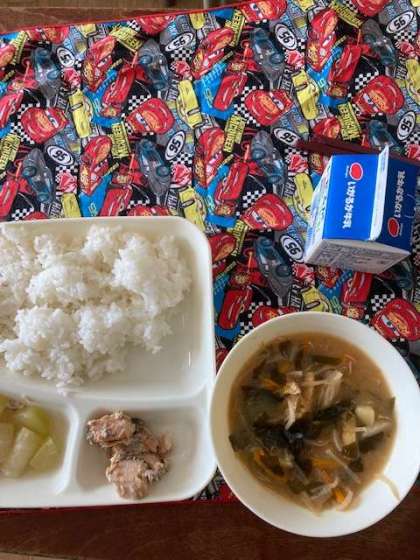 今日の献立は、ごはん、さけのつけ焼き、みそ汁、とうがんの煮物、焼きのり、牛乳です。