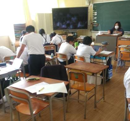 7月8日(金)、6年生は、林間学習についてタブレットを操作して、グループ活動をしていました。