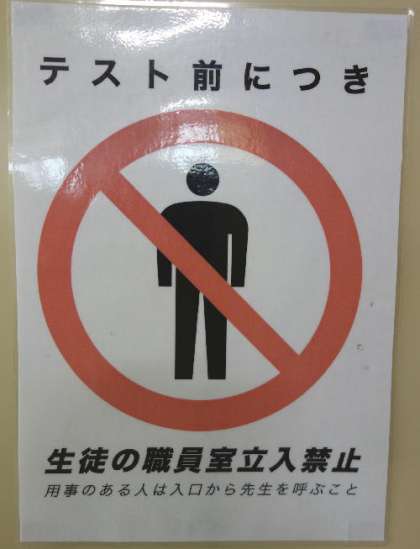 ちなみに、職員室の扉には試験期間中は生徒の立ち入りが禁止なので、写真のような札が掲示されています。小学校では見られない光景です。