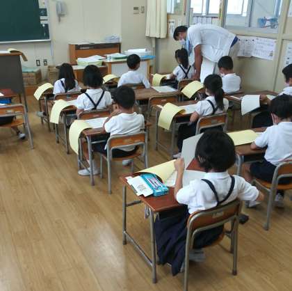 7月19日(火)、「たのしいなつやすみ」という冊子を配布し、1ページずつ丁寧に説明されていました。内容は、宿題、保護者と一緒に考えて欲しいもの、絵日記、読書感想文など色々ありました。